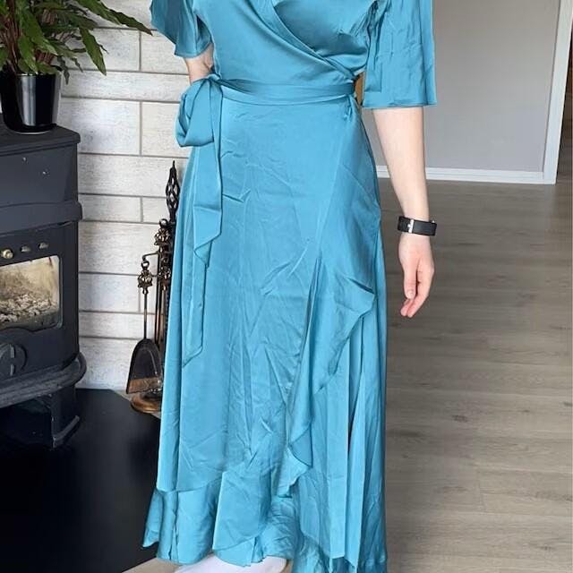 This satin silk ruffle wrap dress is made of charming delicate fabric which offers an eye-catching sheen and a second-skin feeling texture. Maxi dress in softly draping with a V-neck, wrap over front with ties at the waist. Whether you’re petite, curvy, straight or tall, a wrap flatters almost every figure. Because they’re adjustable, you can tie them as loosely or tightly as you like. The tie waist allows you to easily wrap it once or twice around and tie it to fit figure.